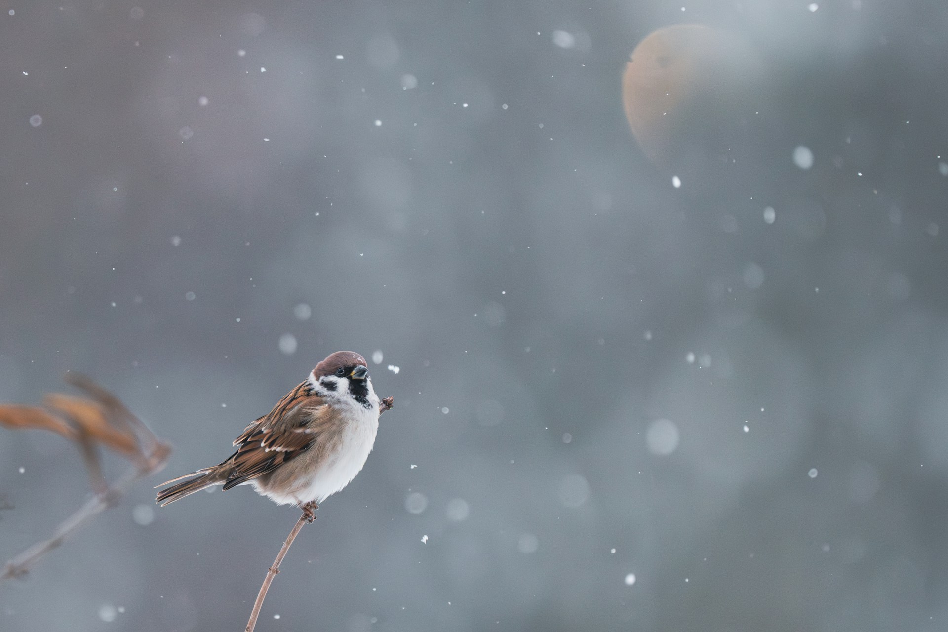 事務所のデスクで、ぼんやり考えていると、雪の上に、少しだけ、顔を出しているバラの枝に、一羽の、雀がとまったのが見えた。